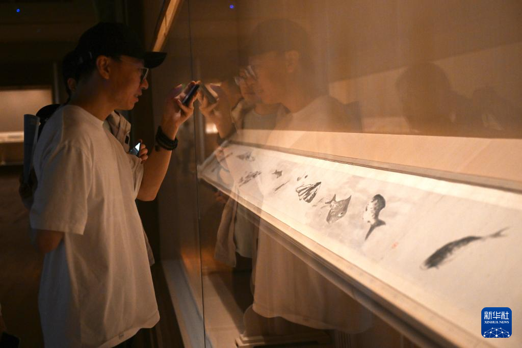 11月14日,观众在上海博物馆东馆中国历代绘画馆拍摄清代朱耷的《鱼鸭图卷》。