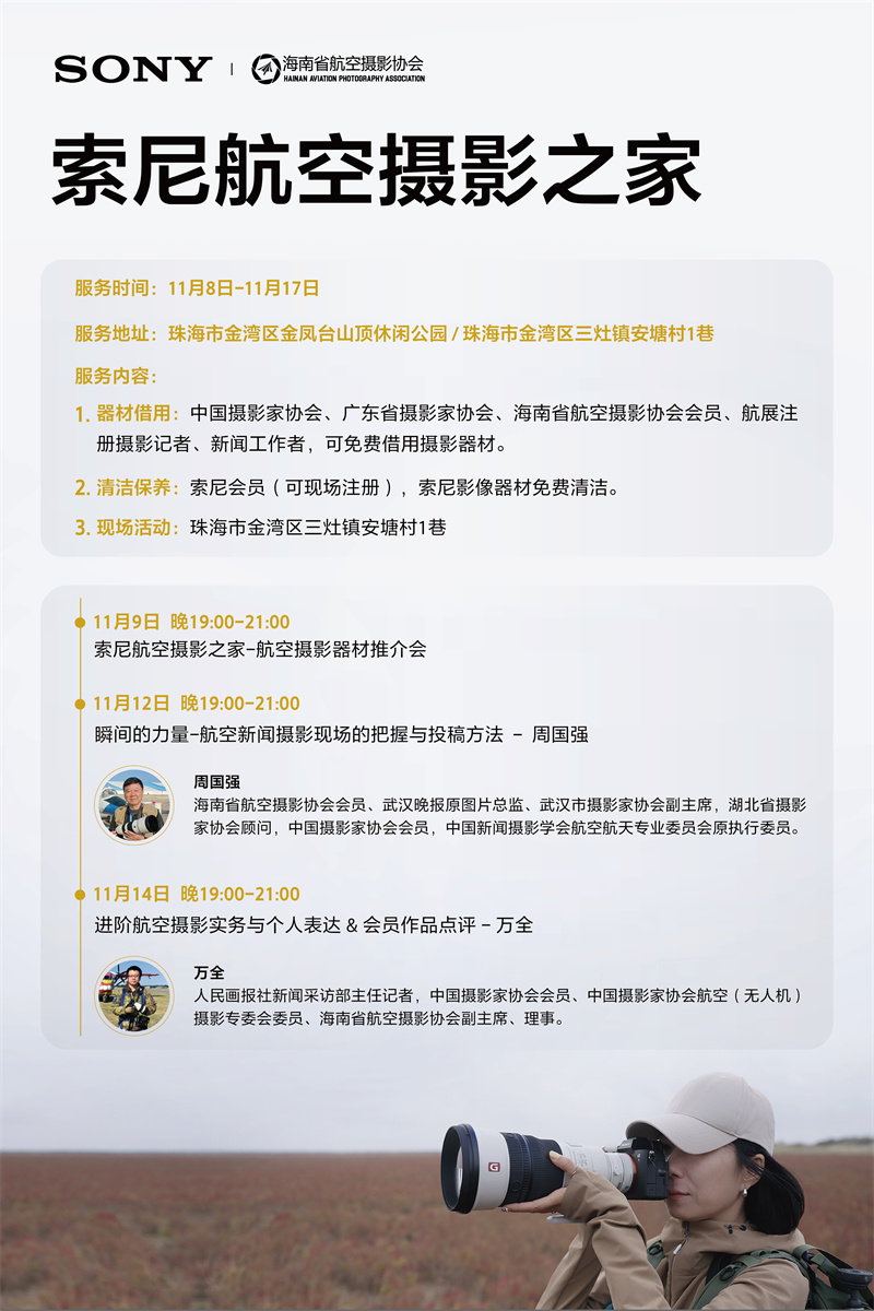 此外,中国摄影家协会、广东省摄影家协会、海南省航空摄影协会会员、航展注册摄影记者、新闻工作者,可在索尼航空摄影之家免费借用摄影器材,感受索尼影像器材在捕捉专业影像方面的独特优势和魅力。