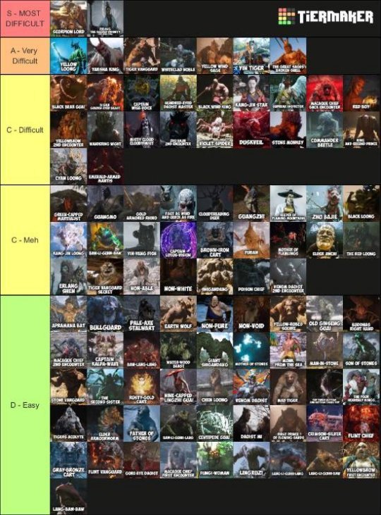 日前有玩家在Reddit论坛里发帖,表示自己刚刚通关了《黑神话:悟空》,并列出了一张Boss难度天梯图。可以看到,在S级(最困难)这一级别里的Boss为毒敌大王与二郎神,A级(非常困难)一级别里的Boss为小黄龙、夜叉王、虎先锋、白衣秀士、黄风大圣以及寅虎。