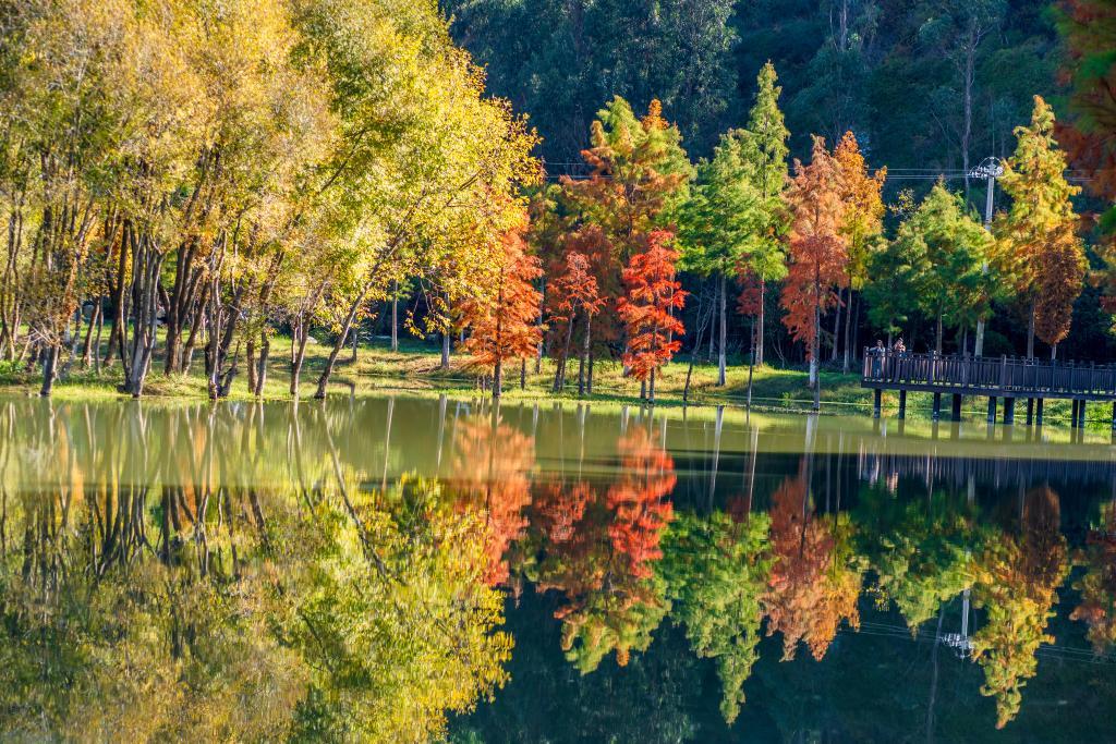 初冬时节,云南省大理白族自治州洱源县的茈碧湖湿地景色宜人,层林披上了斑斓冬装,山水交相辉映,候鸟翩跹起舞,绘就了一幅动人的自然画卷,众多游客纷至沓来。