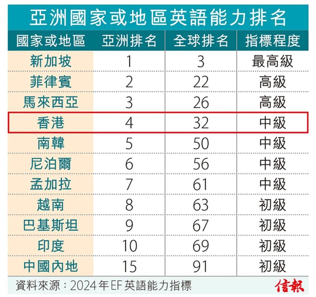 教育机构EF(Education First)每年均进行非英语母语人士的英语测试,分析全球成年人英语能力的变化,今年共有116个国家和地区、超过210万人参加。结果显示,荷兰以636分稳居榜首,挪威、新加坡跟随其后,分别获610分及609分。香港去年获558分,被评为「高级程度」,今年下跌至549分,被降至中级水平,但得分仍较其他内地城市高,包括同获511分的北京和上海。