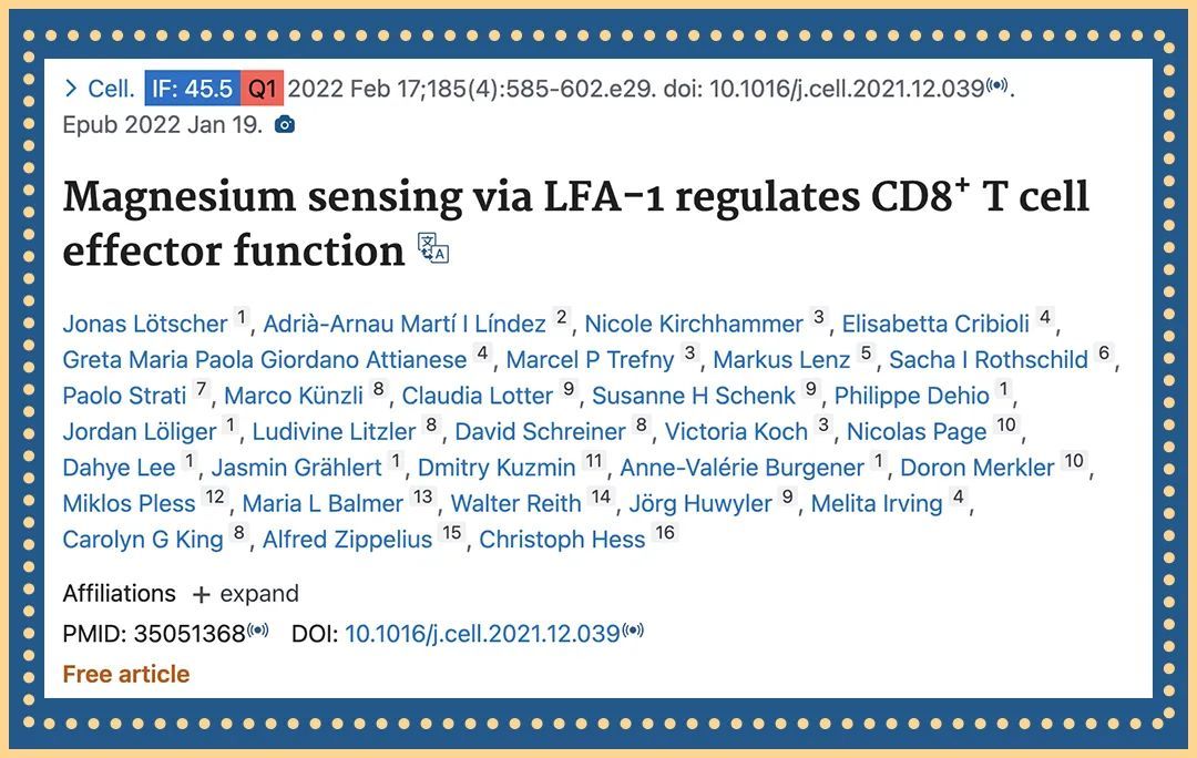 2022年1月19日,瑞士巴塞尔大学研究团队一项发表在cell上的研究发现:在富含镁的环境下,T细胞的免疫力会增强,可有效预防癌症。