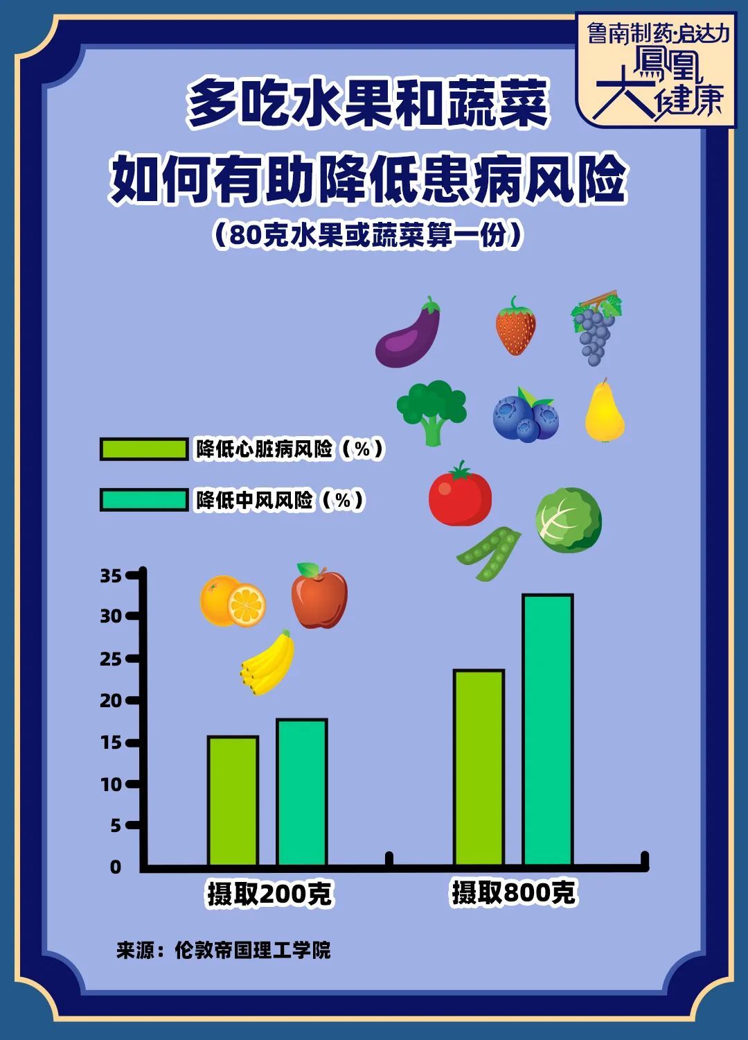 伦敦帝国理工学院的研究证实,每日摄入800克果蔬的人,比每日摄入200克果蔬的人,心脏病和中风风险降低25%-35%。