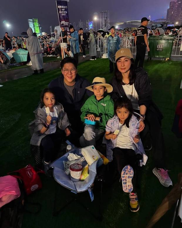 霍启刚晒一家五口看演出全家福 与三个孩子雨中玩耍其乐融融
