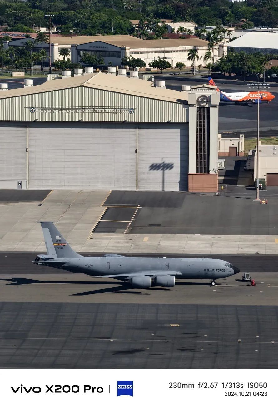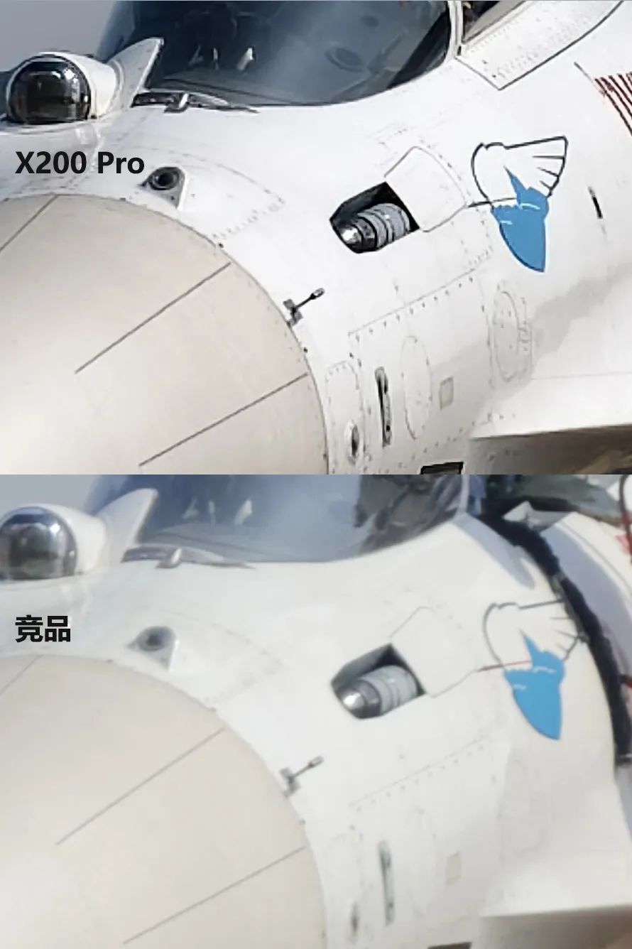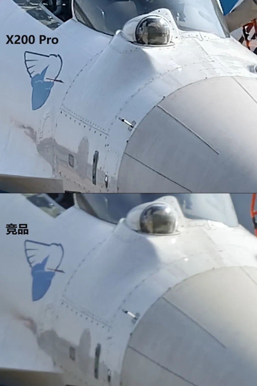 从整体观感上,X200 Pro成像反差更高、饱和度更高,观感更佳,但在100%放大之后,会发现线条边缘锯齿感较为明显;而小米15 Pro成像发灰,100%放大后没有出现线条锯齿问题,但是丢失了许多细节——在同一架飞机上小米15 Pro拍到的铆钉要比X200 Pro少,可以说X200 Pro长焦捕捉到的细节超出对手不少。