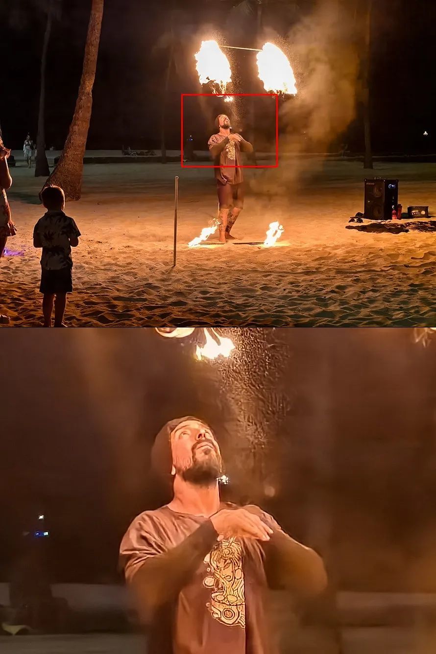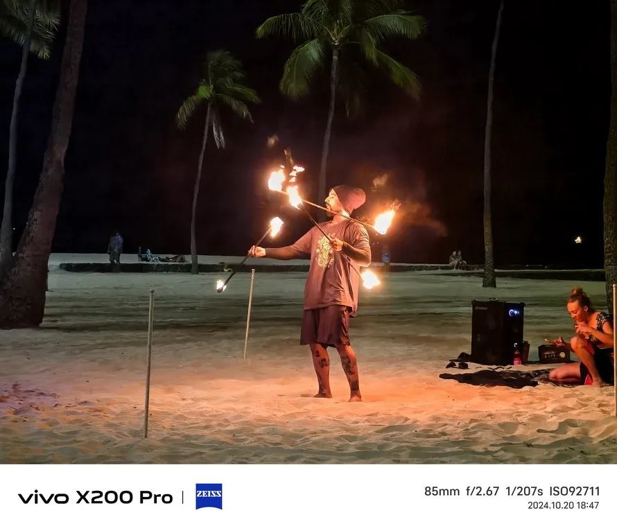 接下来是一张长焦镜头夜拍照片,85mm原生焦距拍摄,场景基本靠表演者手中的火把照明,是一个高反差、亮度不高的场景,此时快门速度为1/381s,感光度高达ISO 20492。在照片放大到100%后,依然能看清人物表情、衣服的图案,表现很不错。