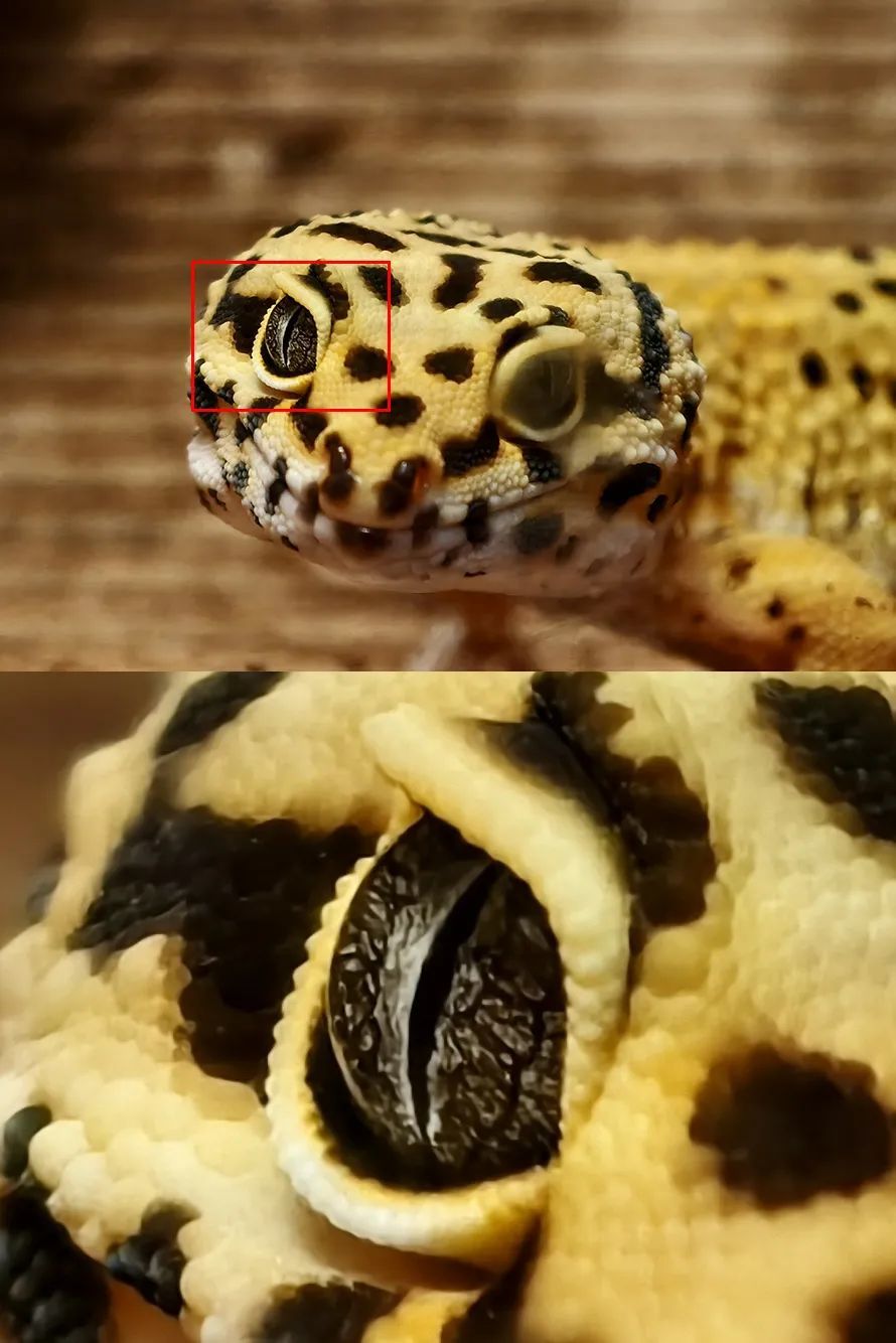 最后一张是20X微距模式抓拍的照片,快门速度为1/298s,感光度为ISO 5552,放大到100%观察蜥蜴眼睛,在隔着玻璃拍摄下细节依然清晰。