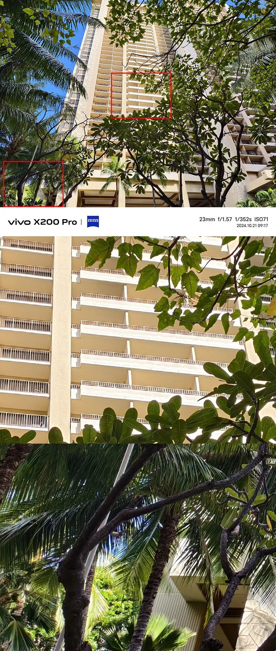 而在成像质量方面,X200 Pro主摄相当扎实,比如下面这张图片,中心的大楼被光线照射,处于照片高光部位,边角树木则因为逆光,处于照片暗部。但是在放大后,会发现无论大楼、还是树木成像都相当锐利、干净。