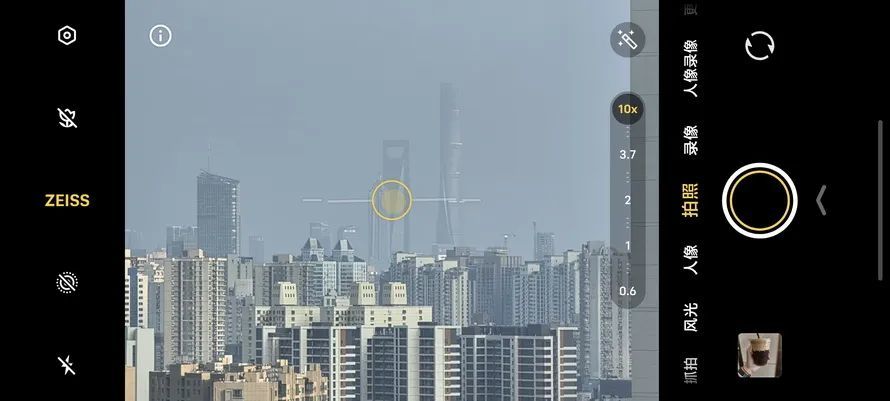 在HP9上,vivo安装了一支等效全画幅85mm视角的蔡司APO长焦镜头,镜头采用1G+5P镜片,光圈为F2.67,同样具备4.5档光学防抖。在相机界面默认菜单中,它是以3.7X、10X两种形式出现,3.7X即85mm视角,10X是230mm视角,是经过裁切实现,最高可以放大到50X,在使用长焦微距功能下,最高20X。
