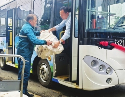 全国劳动模范熊桂林将邮件搬上通村公交J321路。/长江日报记者刘海锋 摄
