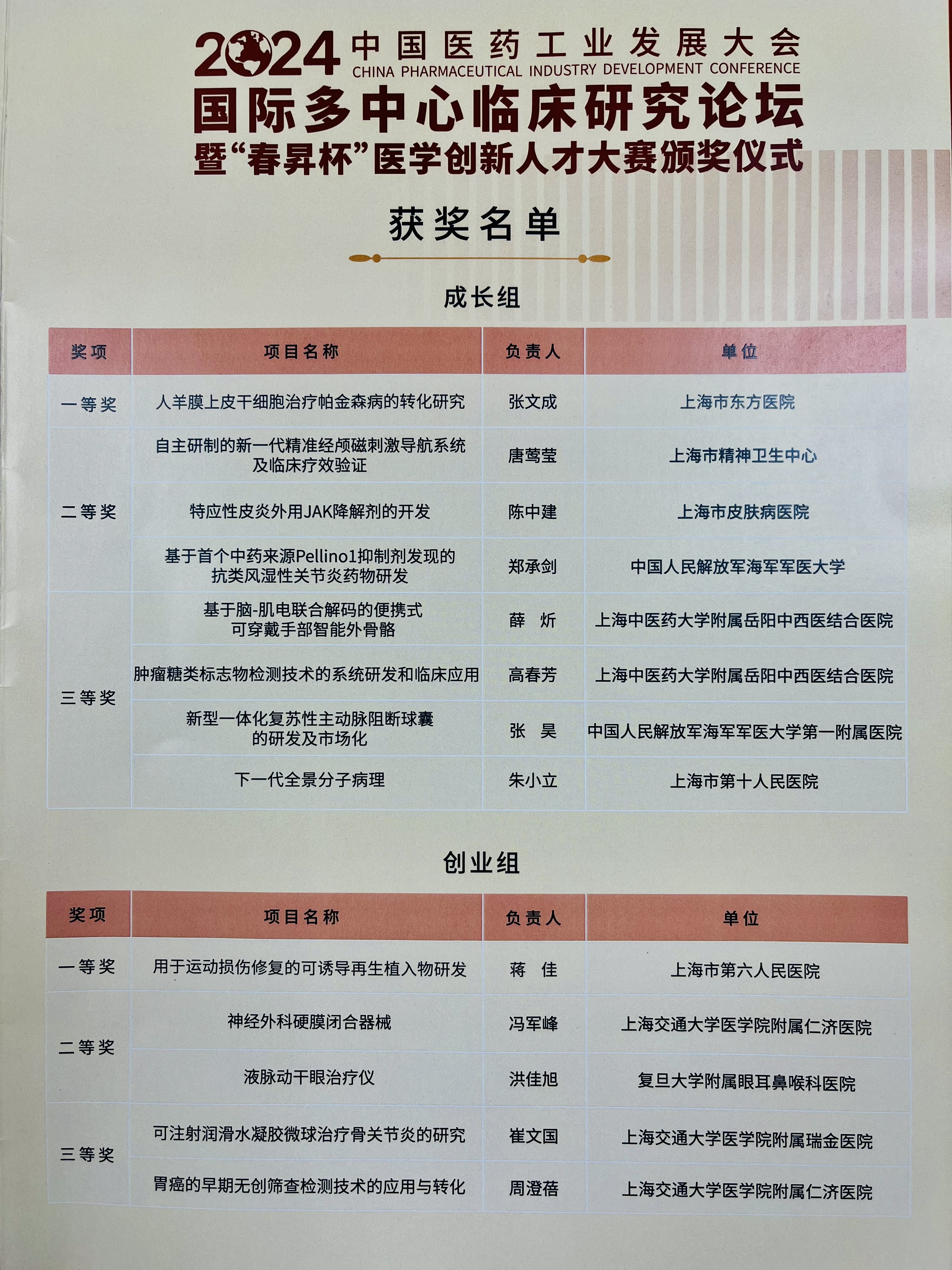 2024年春昇杯共吸引本市医疗卫生机构和医学院校202个项目报名参赛。经激烈角逐,13个项目最终脱颖而出,分获一等奖、二等奖和三等奖。这些获奖项目不仅展示了上海市在医学创新领域的实力,也为未来的生物医药产业发展奠定了坚实的基础。