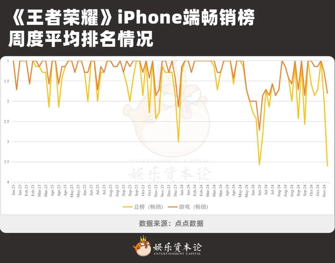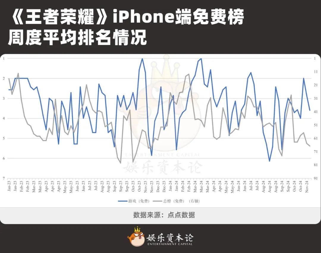 《王者荣耀》作为腾讯乃至国内最长青的一款游戏,用户体量和收入排行都来到了“全民级”。根据时代财经发布的月度《2024年中国常青游戏榜》,《王者荣耀》常年处于霸榜地位,iOS端收入甚至可达第二名《和平精英》的两倍。