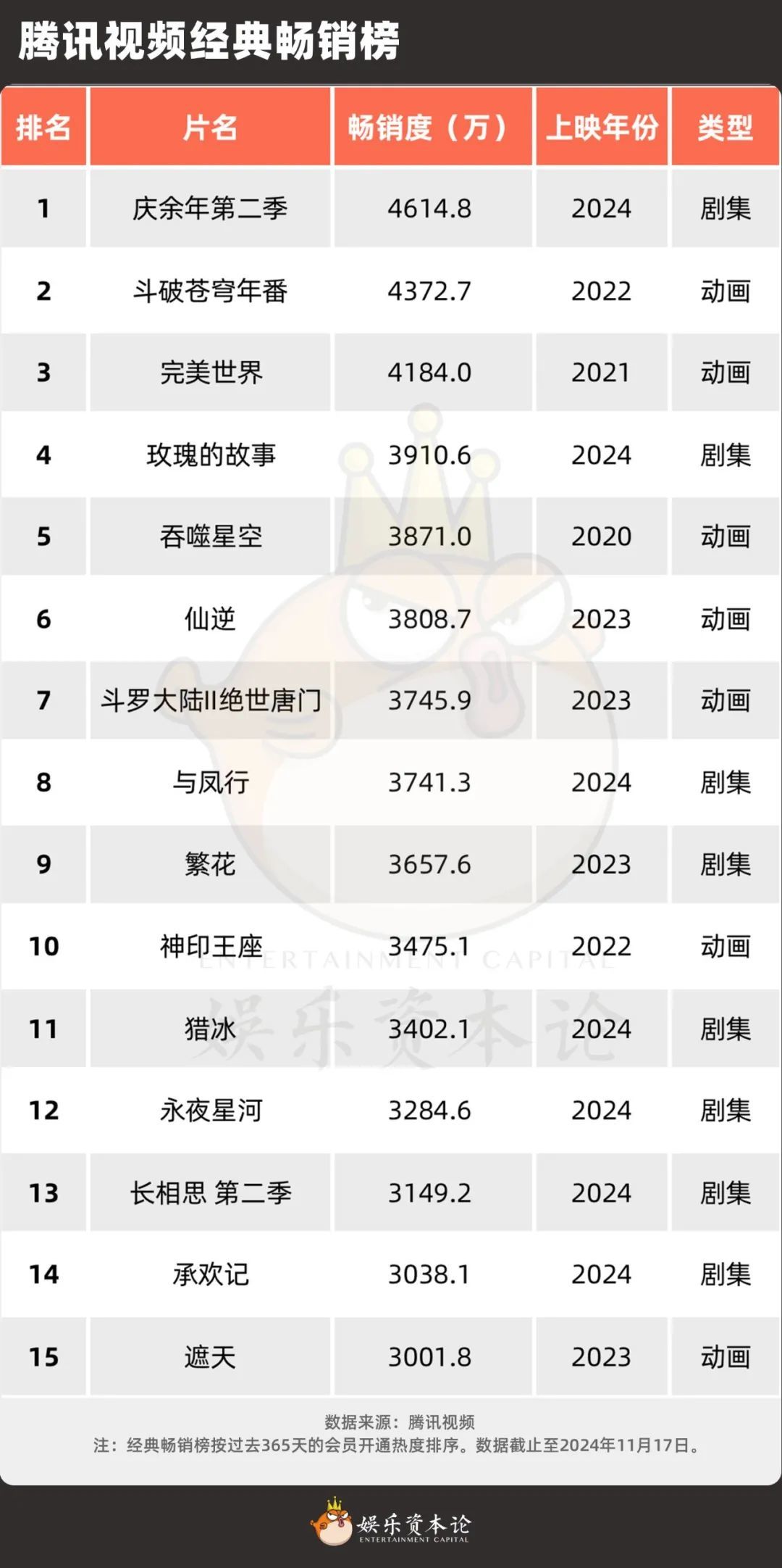 动画对于腾讯视频的影响往往会被低估,而事实上,动漫对腾讯视频会员的拉新能力绝对不容小觑。截止至11月17日,腾讯视频经典畅销榜单前十中动漫占据6席,而其余四席则是《庆余年第二季》、《玫瑰的故事》、《与凤行》、《繁花》这些公认的大爆剧。