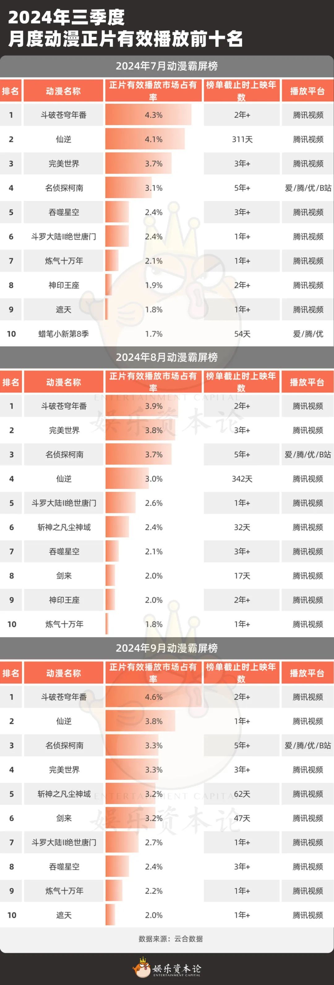 相比较而言,腾讯在动漫领域却是占据了绝对优势。包括三季度在内,腾讯视频常年屠榜云合动漫霸屏榜。除了《名侦探柯南》这一经典日漫外,榜单前十的全部国漫均来自于腾讯视频。