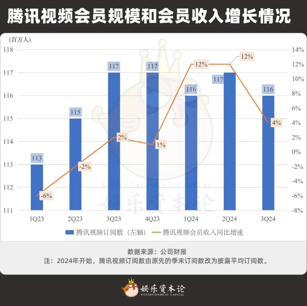整体来看,与游戏业务相比,三季度的腾讯视频显得有些乏善可陈。无论是使用季末订阅数,还是使用平均订阅数,长视频会员增长陷入瓶颈期已经成为人们的共识。本季度的会员收入同样不尽如人意——在一二季度《繁花》、《玫瑰的故事》、《庆余年2》的一连串炸弹过后,三季度的同比增长从两位数回落到4%。