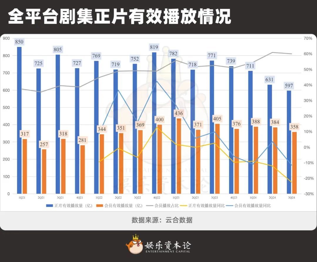 从整个剧集市场的角度来看,三季度的遇冷并非腾讯视频独有。缺少大爆剧的加持,云合统计的季度正片有效播放达到了近四年的最低值,而增速也相应地来到历史低谷。值得注意的是,受到暑假的季节性影响,三季度理论上应为一年里的次高季度。