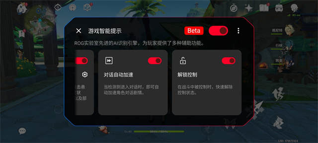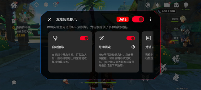 ROG 9系列就在游戏体验方面加入了时下流行的AI大模型——AI识别引擎,他能够根据画面元素为游戏提供帮助,比如在玩《原神》时,每次拾取地上的东西非常麻烦,当ROG 9Pro识别画面中的拾取按钮,就能自动拾取,还有就是跑动一直按着屏幕也确实比较累,点击画面上的按钮就能自动跑动,这些都是让游戏更加方便的体验。