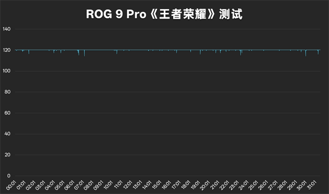 《王者荣耀》120fps+最高画质,半小时平均帧率120帧,平均功耗3.5W,最高温度39.5℃,对于ROG 9 Pro来说,确实过于轻松了,全程120fps体验稳定,无论是对线还是团战,都不成问题,中置布局让双手远离热源,体验上非常好。