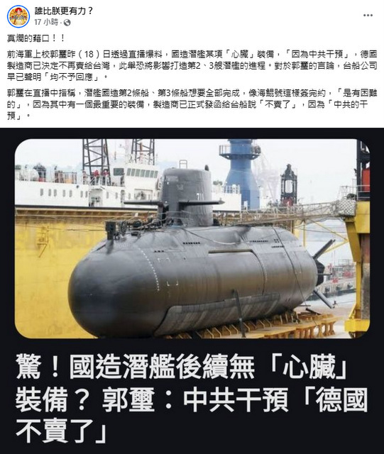 郭玺爆料,台自造潜舰某个“心脏”装备,因为大陆干预,德国制造商决定不卖。脸书粉专“谁比朕更有力”批,真烂的藉口。(照片:谁比朕更有力?脸书)