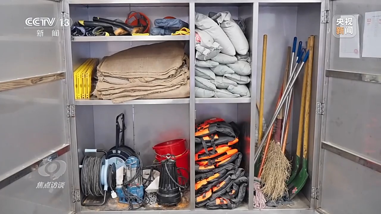 每个站点还配有沙袋、防汛板、救生衣等防汛物资,一旦发生雨水倒灌进站能及时处置。