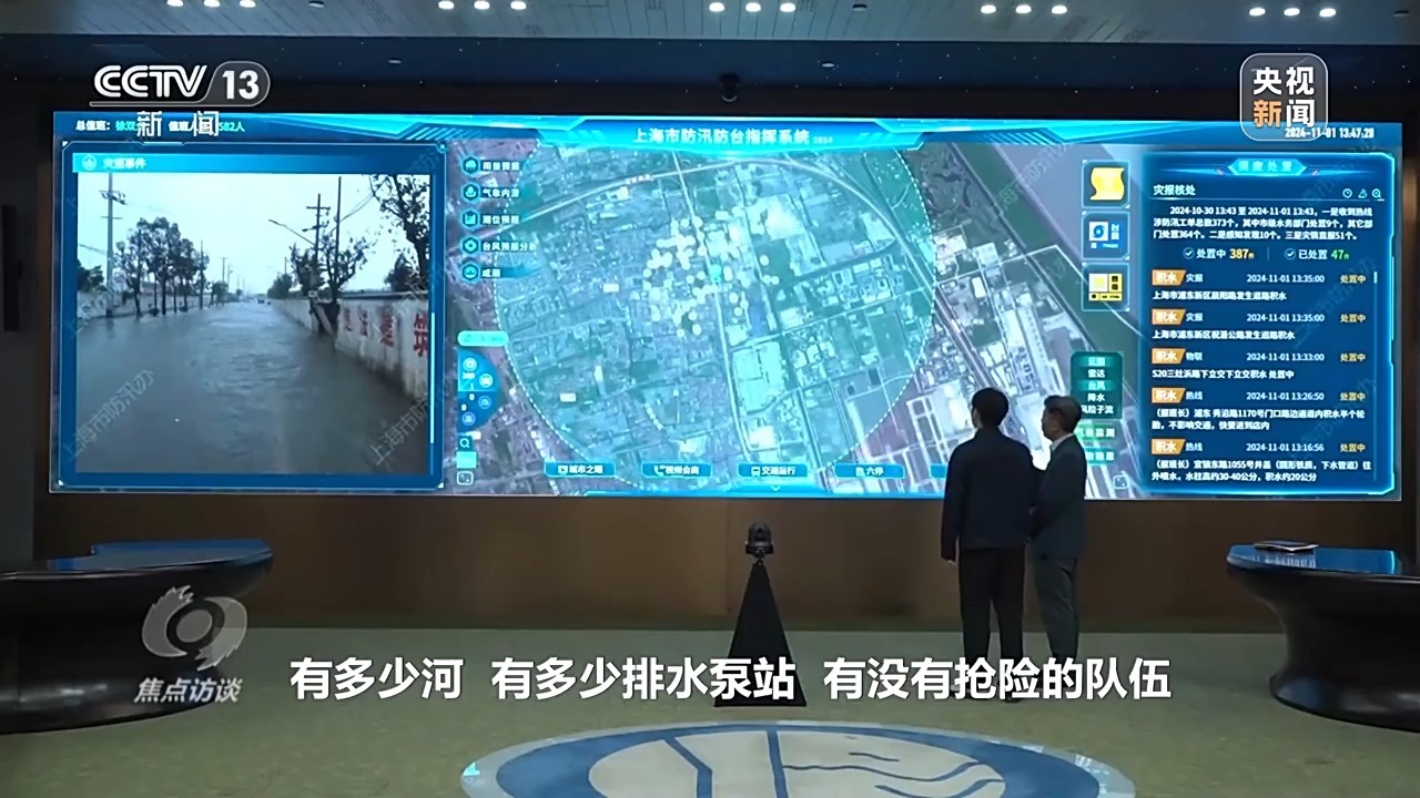 上海市水旱灾害防御技术中心主任 张鹏:如果我们接到了积水的监测信息,说某一个区的某一条路上发生了道路积水,我们利用这个系统会快速检索它3公里范围内有多少河、有多少排水泵站、有没有抢险队伍、有没有物资仓库、有没有人员安置场所,调动最快的、最近的资源来增强我们的城市韧性。