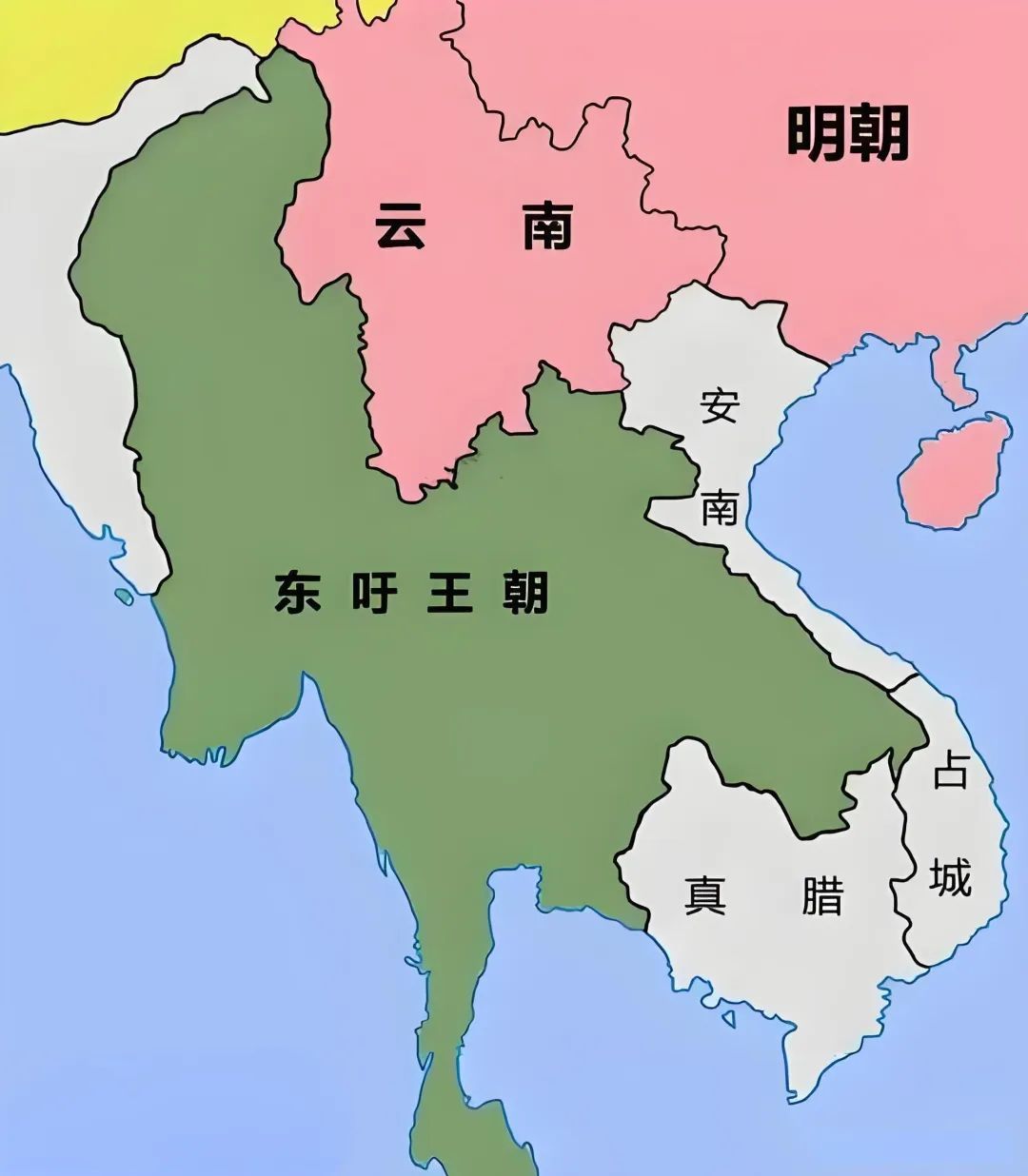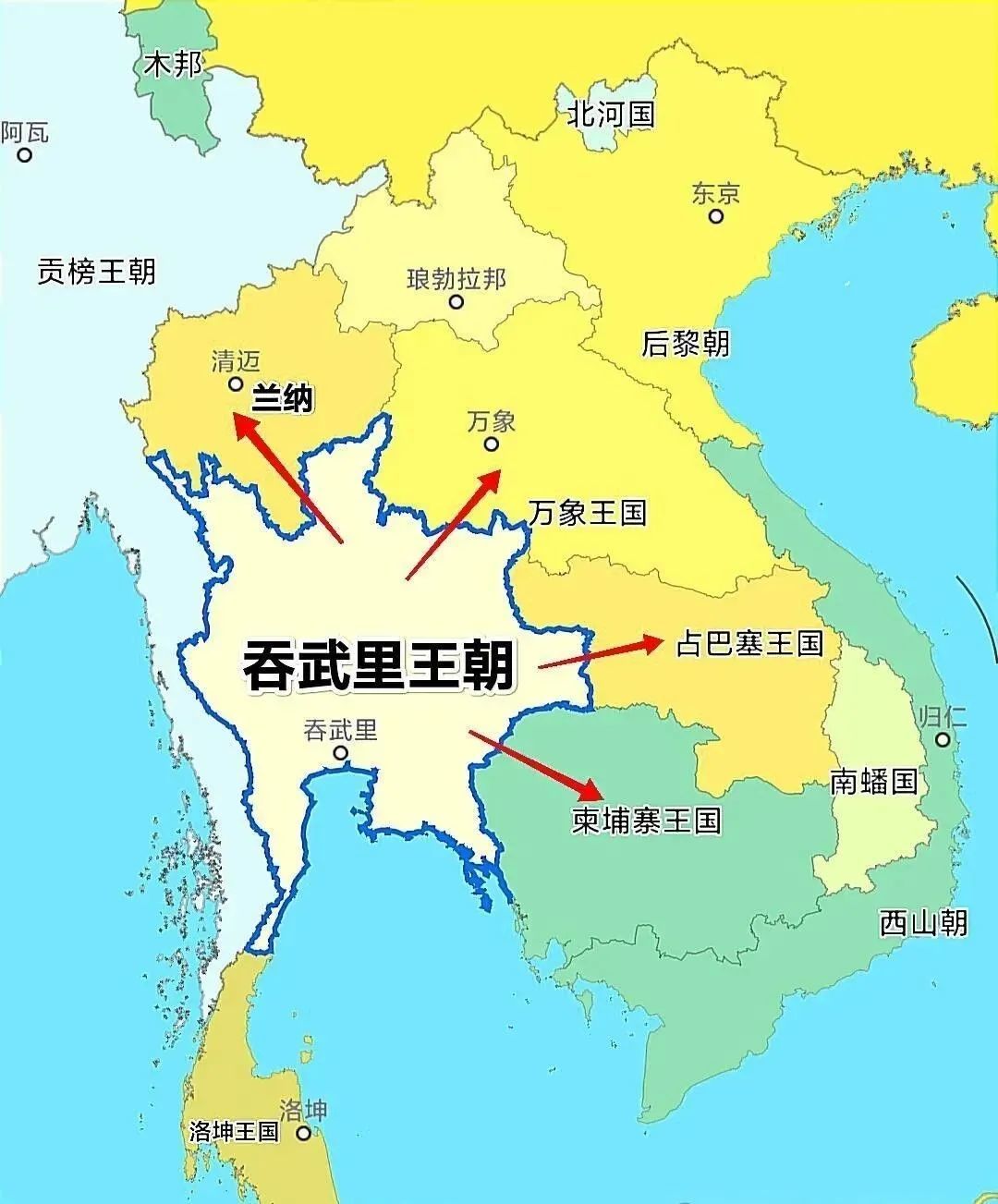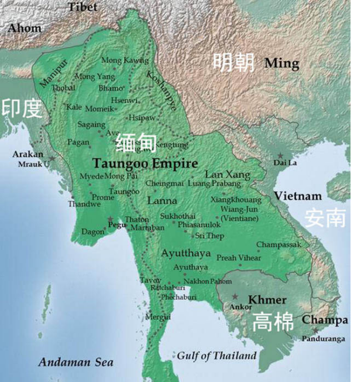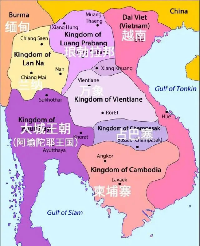 1558年,缅甸先是吞并了靠北的兰纳王国。1560年,又继续向东进攻澜沧王朝,迫使其成为缅甸的藩属国。