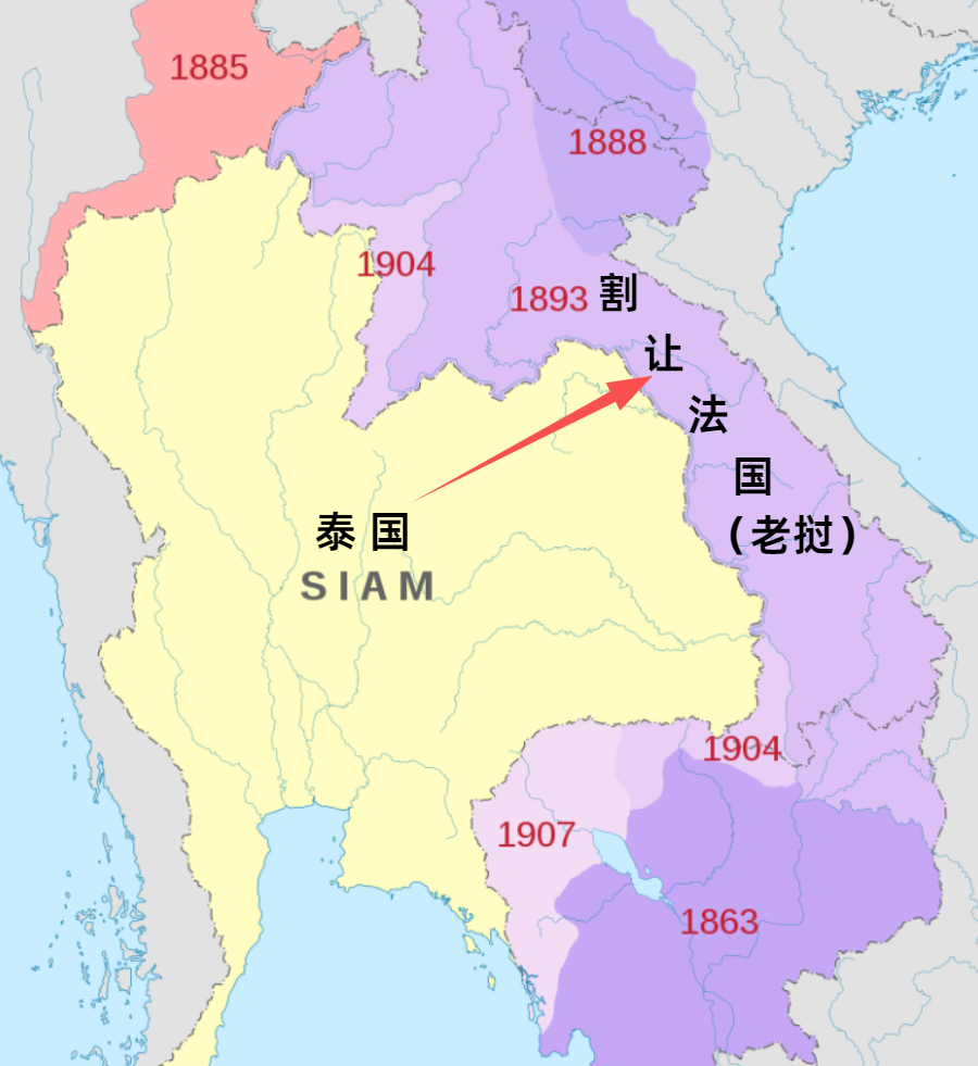 1893年,为避免成为殖民地,暹罗向法国割让老挝,划入“印支”联邦。并于1896年与英法两国签订协议,通过继续割让部分领土的形式,保住了湄南河中下游的核心区域,以及政治上的独立。