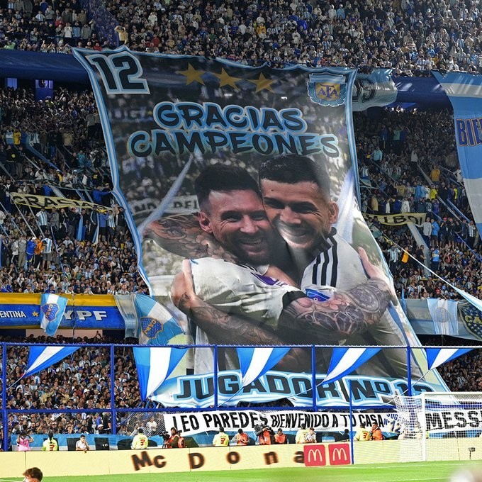 在今天上午进行的世界杯南美区预选赛小组赛第12轮比赛中,阿根廷主场1-0击败秘鲁,现场可以看到,糖果盒球场的球迷举起了梅西和帕雷德斯拥抱的Tifo。