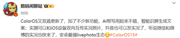【CNMO科技消息】11月20日,有数码博主表示,ColorOS 15又更新了,加了不少新功能,AI帮写用起来不错,智能识屏生成文案;实测可以和iOS设备双向互传实况照片,抖音也可以发实况了,听说微信和微博的实况也快来了,将成为安卓最强livephoto生态。