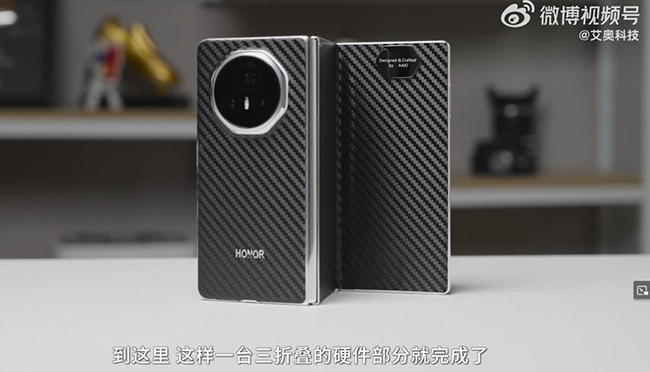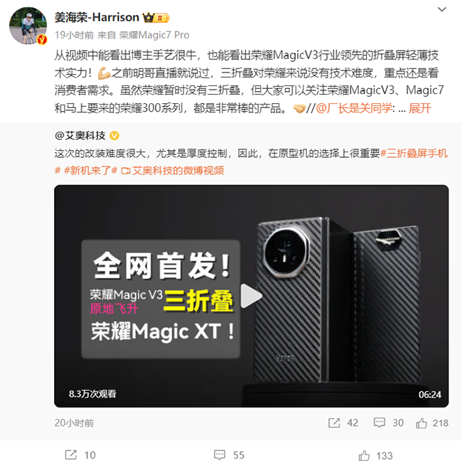 这台三折虽然不是荣耀官方出品,在互动中,网友询问荣耀终端有限公司中国区CMO姜海荣三折叠相关问题,并得到回复,他在微博中夸赞了该博主的改造水平,并且也指出,博主选择这款手机进行改装,从侧面也证明了荣耀MagicV3行业领先的折叠屏轻薄技术实力。