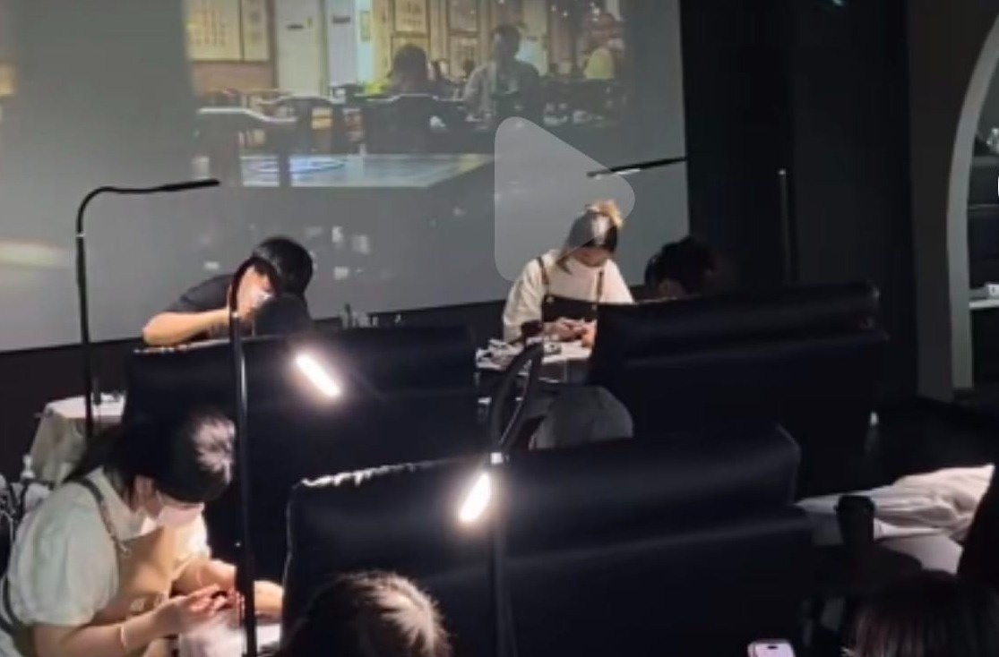 11月19日,记者前往该美甲店看到,店内铺设三排软垫沙发,正对屏幕,方便观影,单个沙发配备美甲师的桌椅和台灯。顾客在沙发上坐着观影做指甲,美甲师背对屏幕认真打磨指甲。