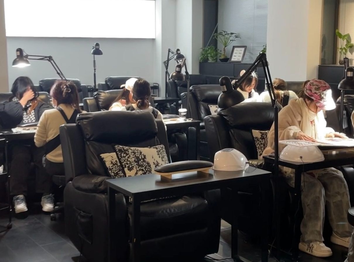 记者观察到,该店的顾客群体也相对年轻,她们坐在沙发上,一会儿看看美甲,一会儿抬头看屏幕影响。这些美甲师普遍年纪不大,还有一名学徒未正式上岗,要在店内帮忙,学习技术。
