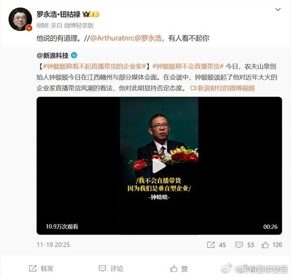 【#罗永浩回应钟睒睒看不起直播带货#】#罗永浩回应钟睒睒直播带货企业家言论#农夫山泉创始人钟睒睒在江西赣州参加活动时表示,我永远不会做直播带货,我认为那些企业是平原型的,我的企业是垂直的,我有根,我看不起直播带货的企业家,你可以做更有价值的东西。