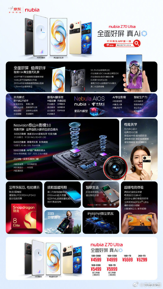 在硬件配置上,Z70 Ultra搭载高通骁龙8 Elite移动平台,最高配备24GB内存和1TB存储。后置三摄系统包括5000万像素主摄和6400万像素潜望式长焦,电池容量为6150mAh,支持80W快充。价格方面,Z70 Ultra的起售价为4599元,提供多个存储版本供消费者选择。