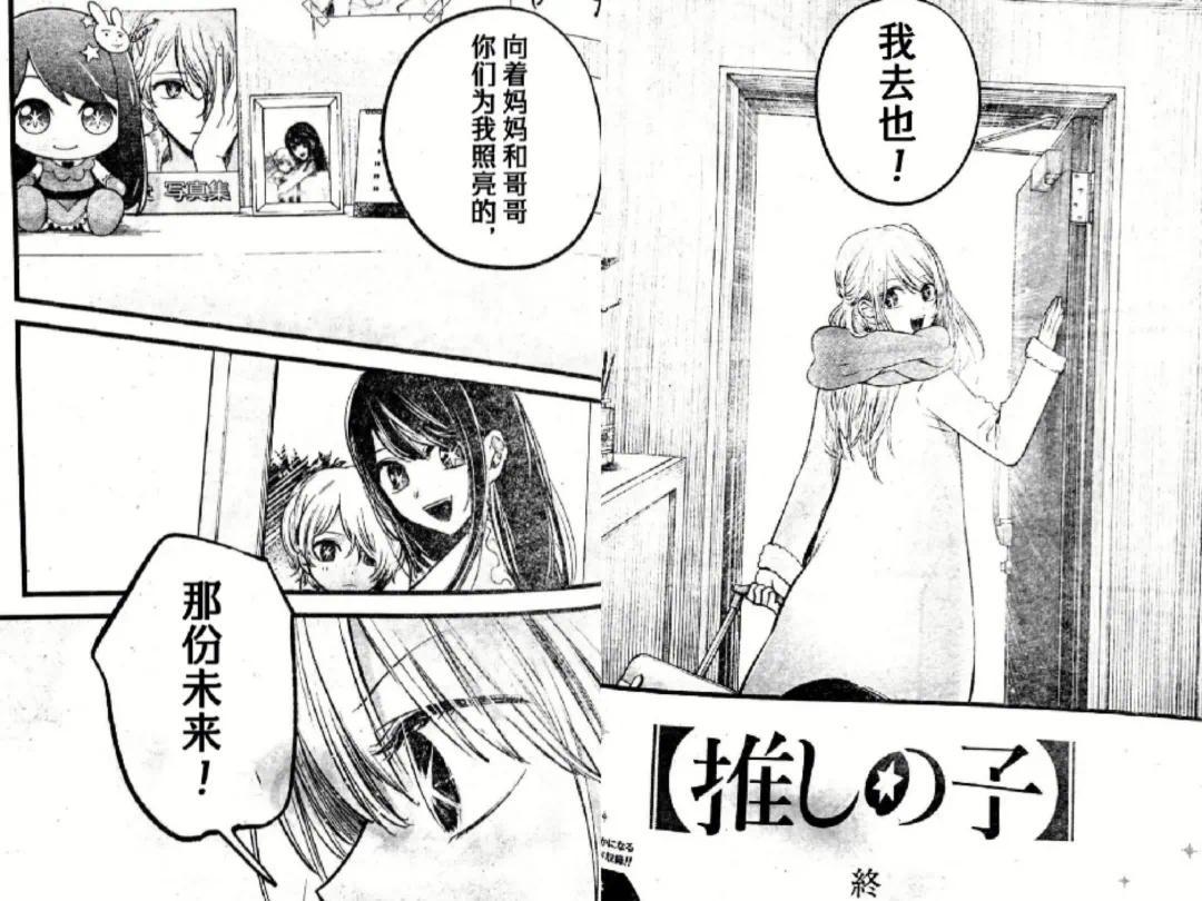 最极端的情况可能是露比陷入星野爱的轮回,遭粉丝刺杀,与家人团聚;或者露比有了孩子,借此机会让阿库亚和星野爱重生,实现另一种意义上的家人团聚。