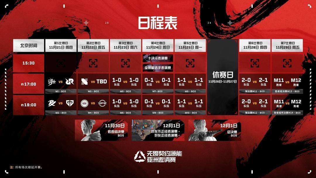 亚洲邀请赛将于11月21日-12月01日进行,本次亚洲邀请赛分为小组赛和淘汰赛两个阶段。参赛的八支队伍将在11月21日-11月25日进行小组赛瑞士轮比赛,前四名将进入11月28日-12月1日的淘汰赛。淘汰赛阶段依旧采用双败淘汰赛制,除败者组决赛和总决赛为BO5外,其它比赛均为BO3。最终脱颖而出的两支队伍将在12月01日的总决赛上,争夺亚洲邀请赛冠军的荣耀。