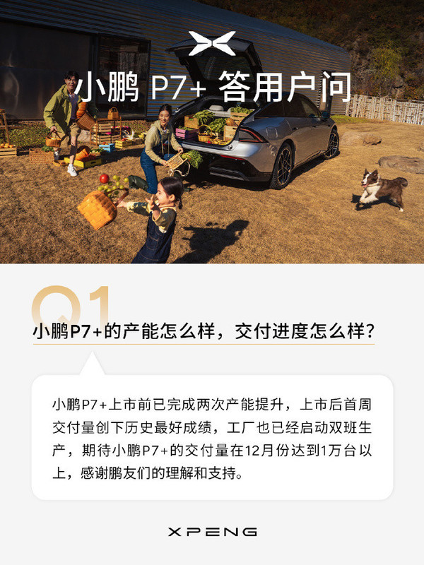 小鹏P7+上市前已完成两次产能提升,上市后首周交付量创下历史最好成绩,工厂也已经启动双班生产,期待小鹏P7+的交付量在12月份达到1万台以上,感谢鹏友们的理解和支持。