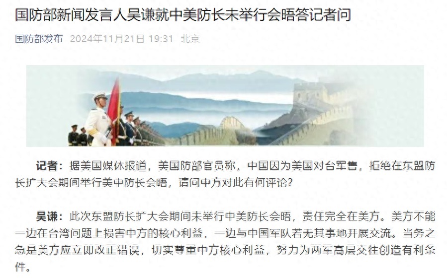 11月21日,国防部新闻发言人吴谦就中美防长未举行会晤答记者问。