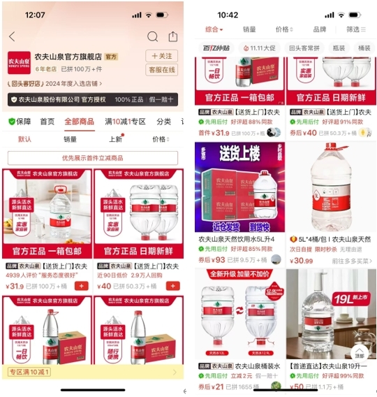 两个平台上主销的商品,为桶装水和整箱的瓶装水,单价平均约为50元。按月销量估计,每月GMV超过千万元。