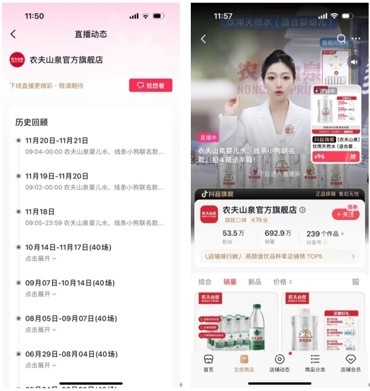 不过,与此同时,农山山泉也在积极地开展直播和电商业务。记者查询了抖音和拼多多APP,发现农夫山泉在两个平台均开通了品牌旗舰店,并长期通过直播带货。保守估计,两个平台每月销售额预计超过千万元。