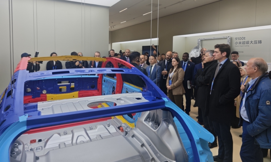 走出汽车展厅,外交官们来到小米的汽车生产车间,随即迅速被这一现代化、智能化、自动化的生产车间所吸引。每76秒就有一台小米汽车从工厂中下线,仅用230天就完成下线10万辆整车,一系列耀眼的纪录,让外交官们对生产车间竖起了“大拇指”。