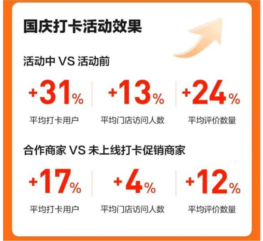 此外,此次招商还针对大、中型连锁餐饮商家开放了SA级品牌合作,轻快餐需>1000家,正餐要>150家,参与SA级品牌合作平台将升级合作资源,可联系到餐业务经理参与。亿邦动力了解到,参与打卡提升的商家冲榜成功率高于无法打卡提升的商家1.4倍,打卡、评价涨幅约30%。
