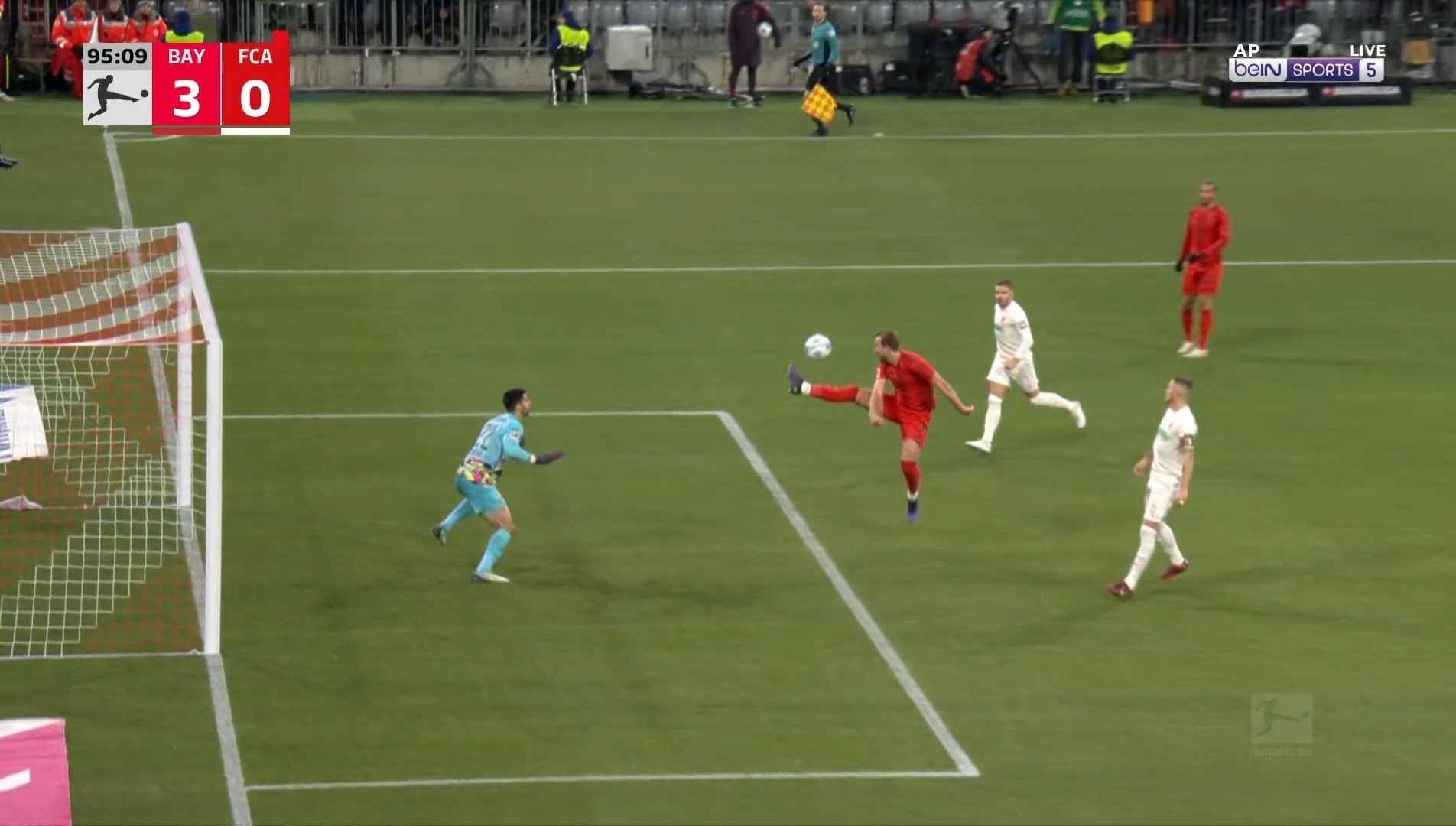 在看到队友格雷茨卡送出的过顶斜传后,凯恩冲入禁区,并用德甲logo式的动作进行了一次停球,这个动作还骗过了奥格斯堡门将拉布罗维奇从而使其失去重心倒地,随后凯恩轻松将球顶进空门。