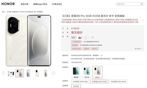 在11月21日荣耀300开启预订之后,22日,荣耀300 Pro也开启了100元订金预订活动。预订页面显示,荣耀300 Pro共有墨岩黑、茶卡青、星光沙三种配色,其中星光沙为专属配色。存储方面,有12GB+256GB、12GB+512GB、16GB+512GB三种存储配置可选,发布会结束当晚可以支付尾款。