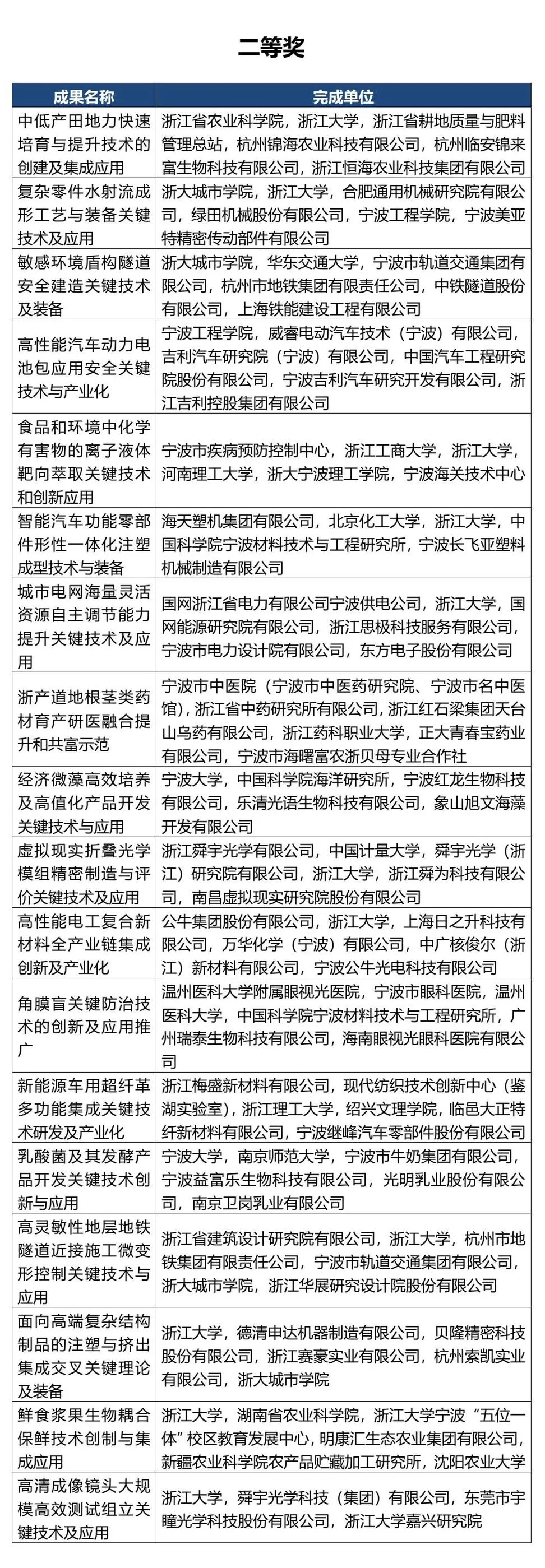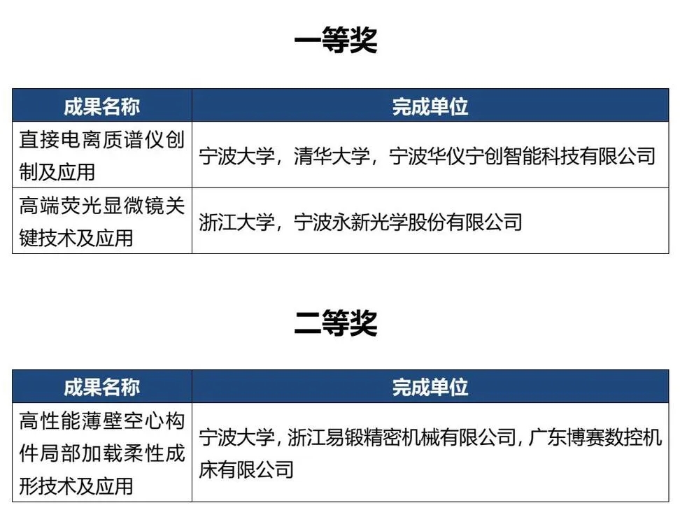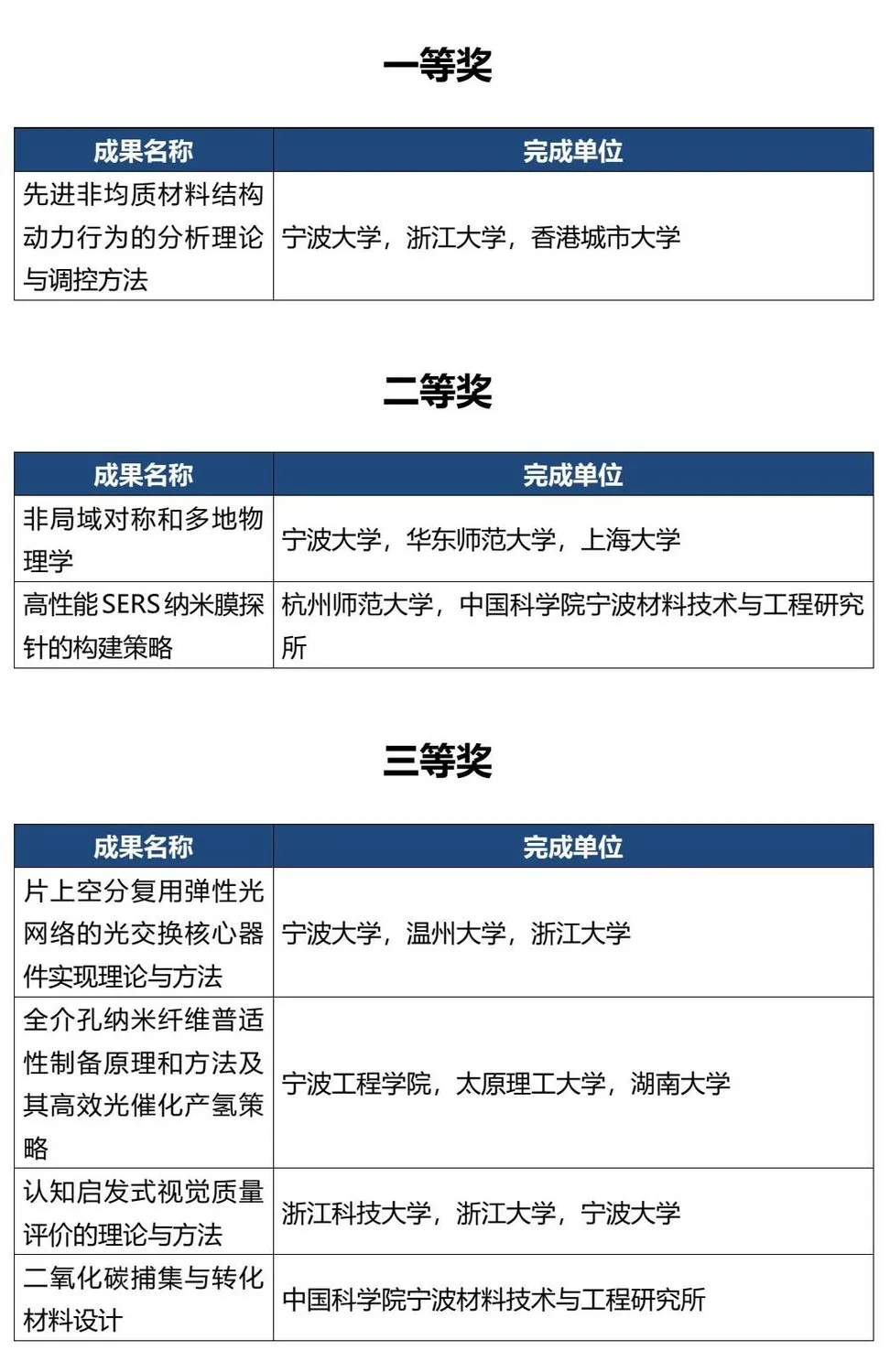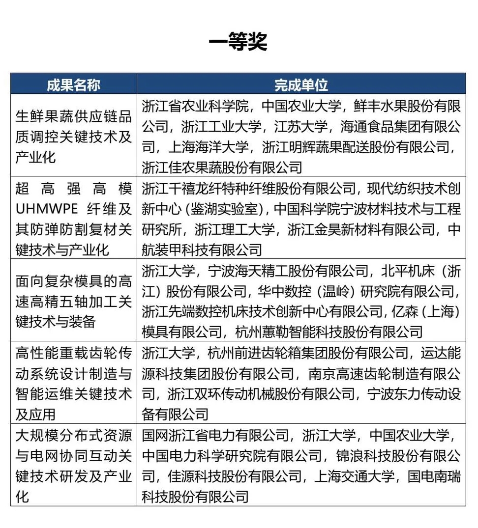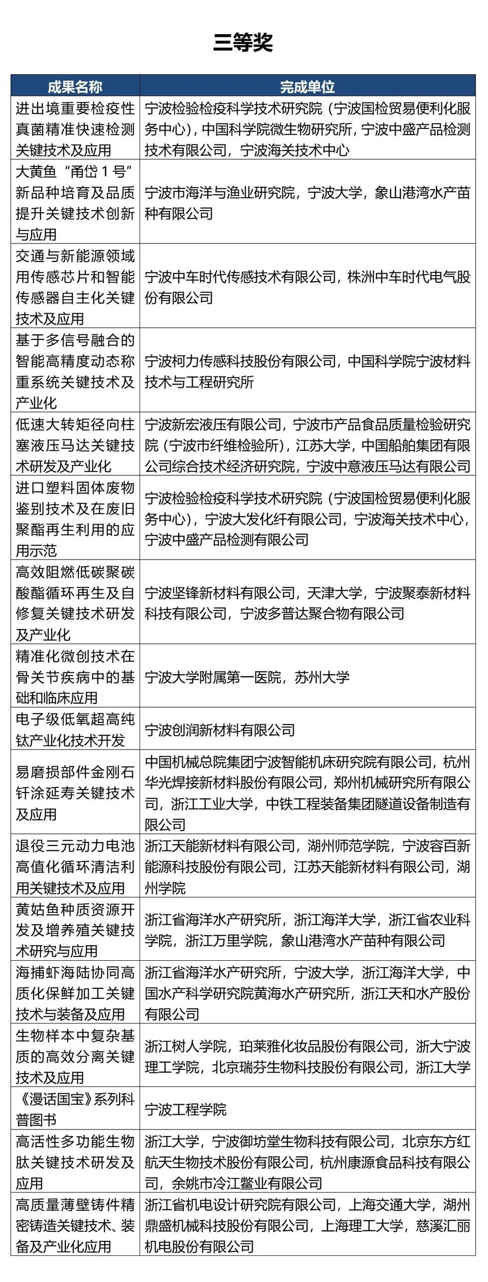 宁波大学牵头完成的先进非均质材料结构动力行为的分析理论与调控方法,获得省自然科学奖一等奖;宁波大学牵头完成的直接电离质谱仪创制及应用,宁波永新光学股份有限公司参与完成的高端荧光显微镜关键技术及应用,获得省技术发明奖一等奖;海通食品集团有限公司等参与完成的的生鲜果蔬供应链品质调控关键技术及产业化,中国科学院宁波材料所等参与完成的超高强高模UHMWPE纤维及其防弹防割复材关键技术与产业化,宁波海天精工股份有限公司等参与完成的面向复杂模具的高速高精五轴加工关键技术与装备,宁波东力传动设备有限公司参与完成的高性能重载齿轮传动系统设计制造与智能运维关键技术及应用,锦浪科技股份有限公司等参与完成的大规模分布式资源与电网协同互动关键技术研发及产业化,获得省科技进步奖一等奖。