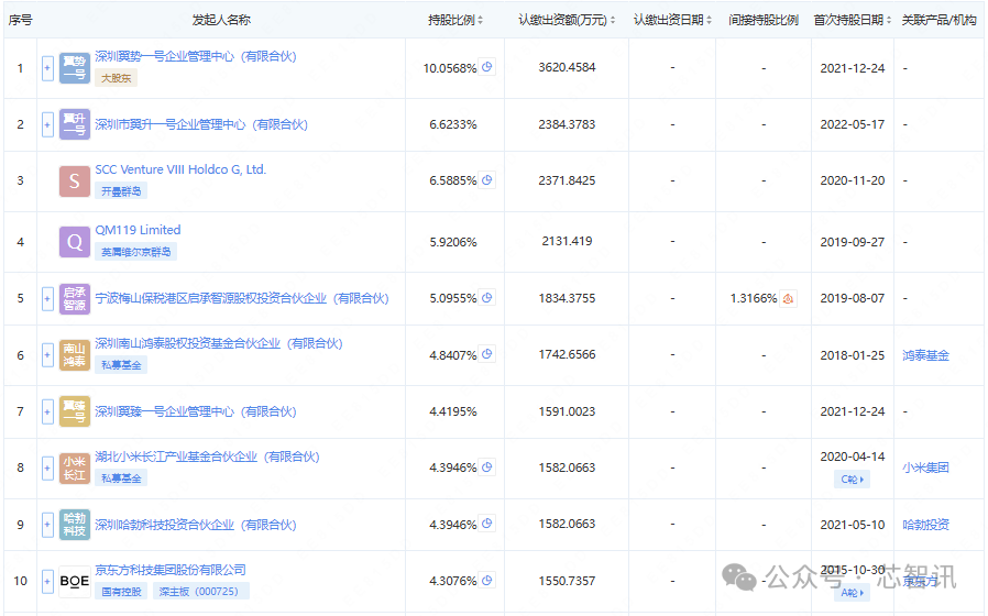 从股权结构来看,目前云英谷的前十大股东分别为深圳翼势一号企业管理中心(有限合伙)(10.0568%)、深圳市翼升一号企业管理中心(有限合伙)(6.6233%)、SCC Venture VIII Holdco G, Ltd.(6.5885%)、QM119 Limited(5.9206%)、宁波梅山保税港区启承智源股权投资合伙企业(有限合伙)(5.0955%)、深圳南山鸿泰股权投资基金合伙企业(有限合伙)(4.8407%)、深圳翼臻一号企业管理中心(有限合伙)(4.4195%)、湖北小米长江产业基金合伙企业(有限合伙)(4.3946%)、深圳哈勃科技投资合伙企业(有限合伙)(4.3946%)、京东方科技集团股份有限公司(4.3076%)。可以看到云英谷的股权非常分散。