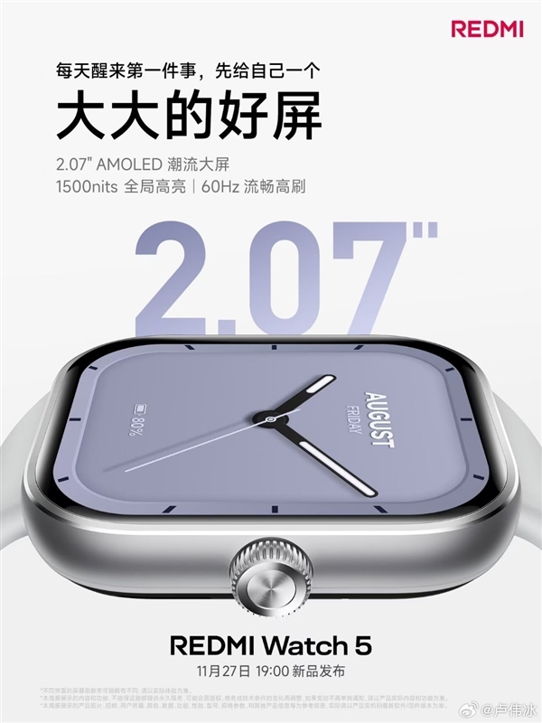REDMI Watch 5将与K80系列同台发布,官方今天公布了详细屏幕参数。