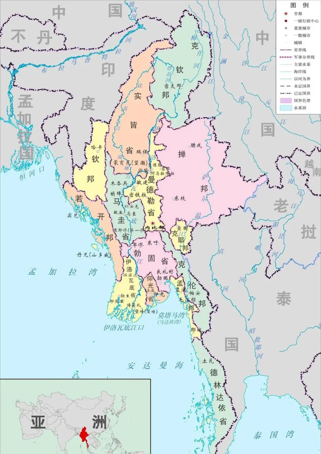 缅甸地形条件优渥,缅族聚居在伊洛瓦底江、萨尔温江浇灌的中心平原地带,缅甸南侧临海,北东西三面的山区中生活着大量少数民族。