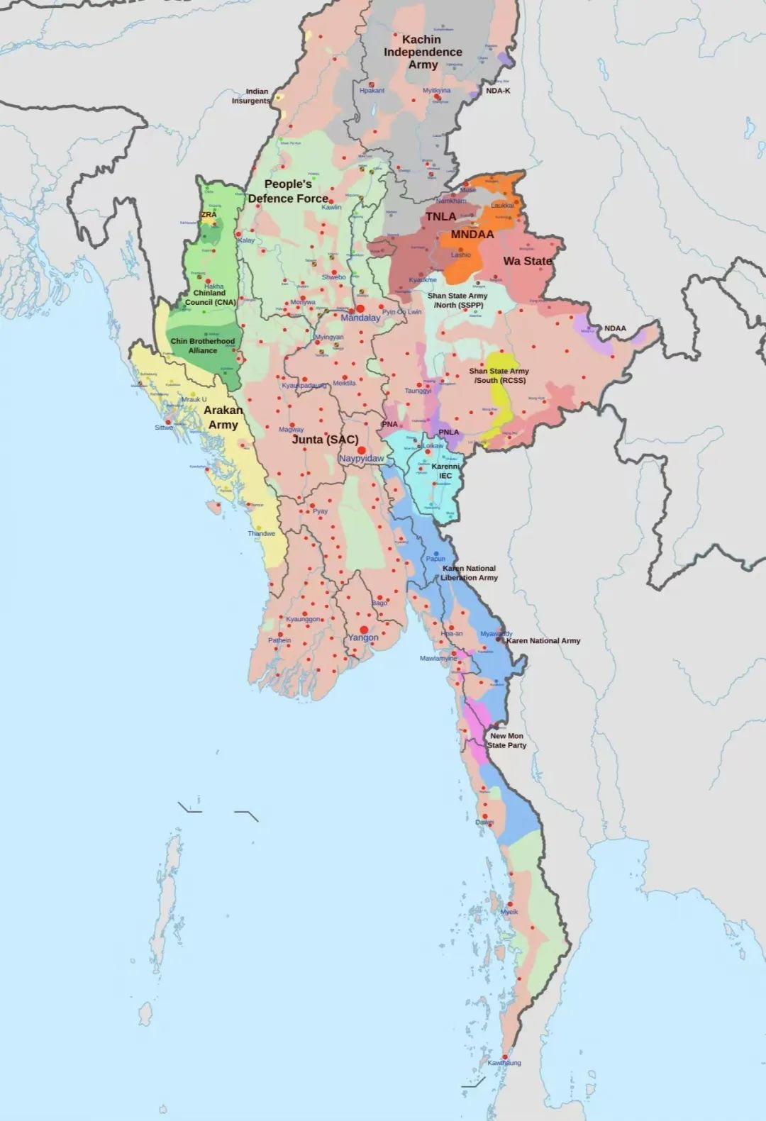 ▲若开军控制区(米黄色)与缅军据点(红点)