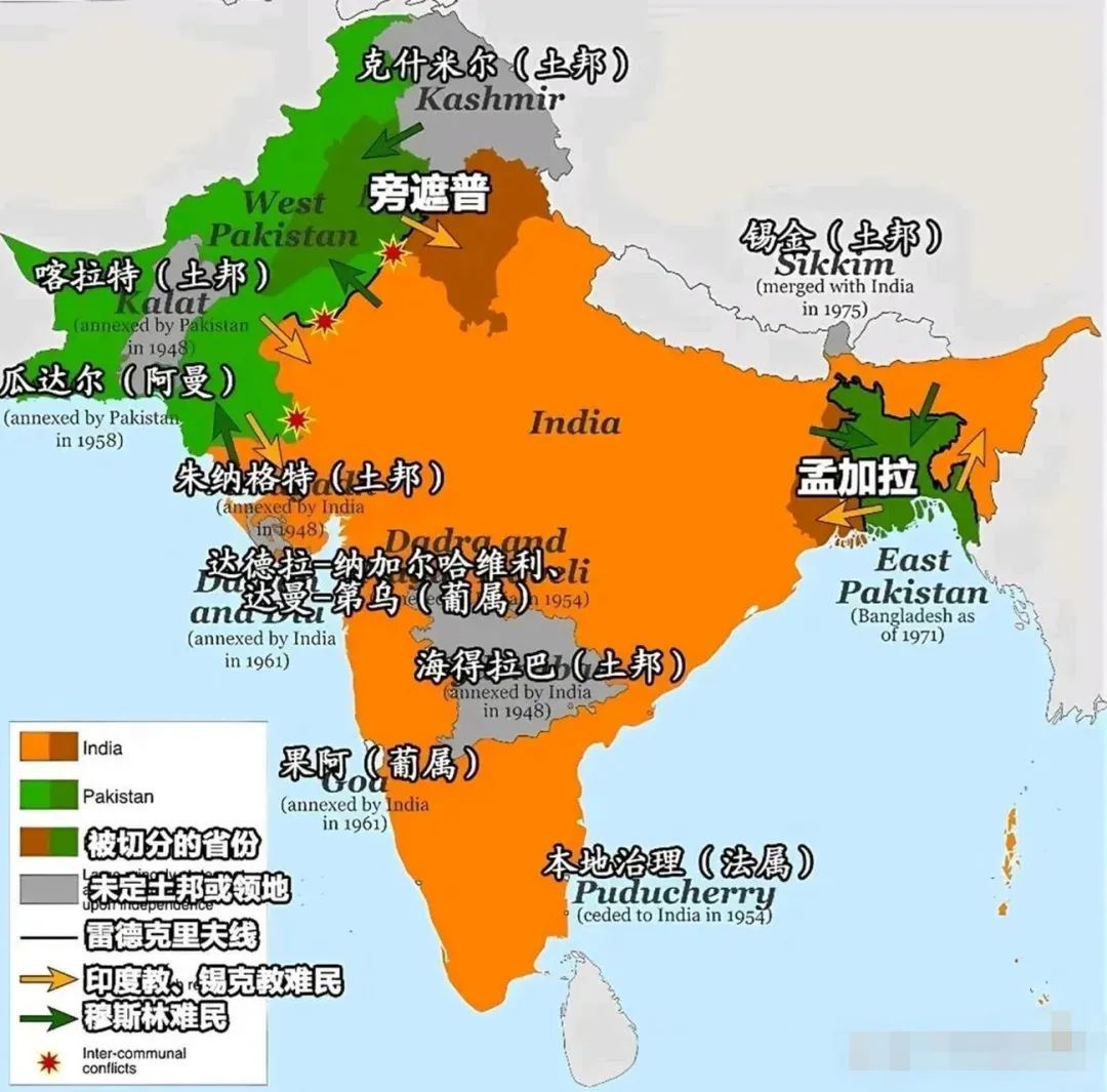 二战后,英国无力维系其庞大的殖民地。英属印度独立为印度和巴基斯坦。